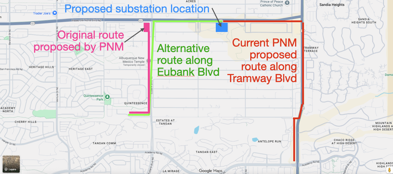 PNM’s original proposal to locate the substation at the southwest corner of Paseo del Norte and Eubank (see purple lines on the map above) would reduce project costs by about $3 million compared to the fire station location. Any increase in cost from the longer route would ultimately be borne by all PNM ratepayers.
