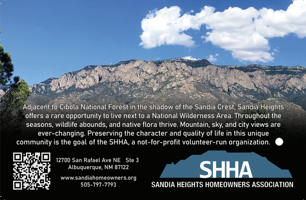 The Sandia Heights Homeowners Association has produced this promotional information card specifically for use by real estate professionals. But this may be useful for anyone else wishing to share informational material about Sandia Heights.